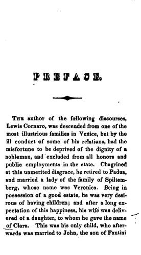 Lewis Cornaro, also called Alvise or Luigi, was an Italian nobleman who lived during the 15th and 16th centuries. Discourses on a Sober and Temperate Life collects his four key writings on the importance of diet in sustaining health and long life. In it, he describes his youth of indulgent living, which lead to a great decline in his health and near death in middle age. Acting on doctors' advice, he then completely changed his habits, strictly limiting both eating and drinking. He explains how this change saved his life, gave him the strength to fight off illnesses, overcome physical injuries, and live a vibrant and fulfilling life into his eighties. (He claims to have reached his mid-nineties or more, but scholarship suggests this is exaggeration.) In addition to limiting food and drink intake, he emphasizes the importance of determining which particular foods and drinks best suit each individual. He argues that anyone can follow this strategy, citing examples of historical figures who have done. He advocates for the wisdom and pleasures of old age, asserting that life only improves with time and that to be old should be a goal, not something to fear. Indeed, he even argues that healthy living eliminates the fear of death, and facilitates a gentle and painless passing on to the next world.