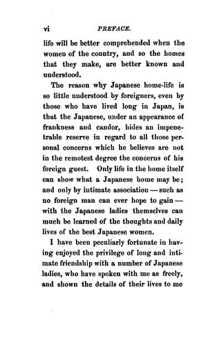 A clear and delightful peek into the world of Japanese girls and women of the late 1800s: their childhood, education, marriage and intimate family life. And it is done by someone who admires the immense resources, abilities and strength shown by all of these girls and women. The intricate customs that bind the society together and must be learned by every girl, such as the annual Doll ceremony are explained as well as the difficult life of a Japanese wife of this period. Life among the nobles and upper class in the courts and castles, something long hidden away, is explored. Did you know there were Samauri Women? The entire spectrum of Japanese life in the late 1800s is explored from the feminine point of view. The writer is a Christian but respects the cultural and religious differences of Japan society and presents what she has observed from many years in the country and what was shared with her by her Japanese women friends. (Summary by Phil Chenevert)