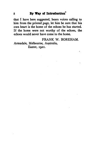Frank Boreham was a well known preacher who served in England, Australia, and New Zealand. He published dozens of books and thousands of editorials during his lifetime, with no sign of slowing down, even up until his death at age 88. He wrote with a distinctive style, seeming to be able to draw a spiritual lesson out of any conceivable topic.