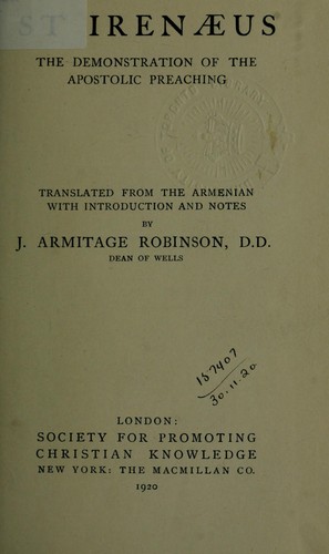 Eusebius in his Ecclesiastical History tells us that in addition to his great work Against Heresies, St Irenaeus wrote A Discourse in Demonstration of the Apostolic Preaching. This work was entirely lost sight of: no one seems ever to have quoted a word of it. But it has quite recently reappeared in an Armenian manuscript together with Books IV and V of the greater work. The Armenian translation proves to be a fairly close rendering of the original Greek… What Irenaeus undertakes in the present work is to set out the main points of this Apostolic message, which, as he has explained in his greater work, has been handed down in the Church by the successions of the bishops and is the same in substance in all parts of the world, and to demonstrate its truth more especially from the sacred scriptures of the Old Testament. - Summary from Preface