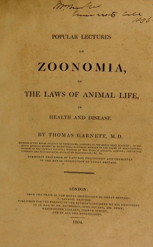 Popular Lectures on Zoonomia Or The Laws of Animal Life, in Health and Disease